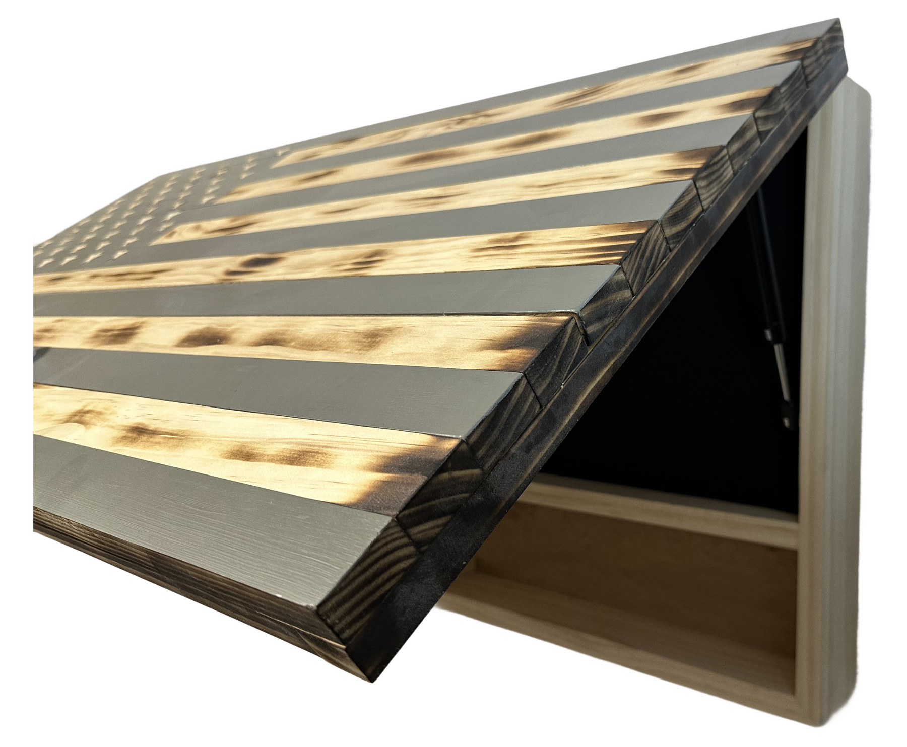 • Patriotic & Secure: Classic burnt wood American flag design with hidden firearm storage.