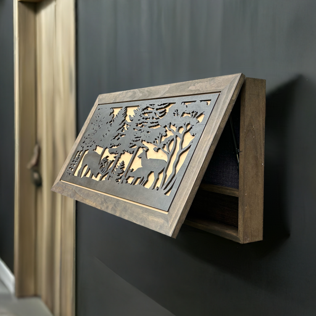 Securely store your gun and other home self defense gear inside the Bellewood Designs Large Hidden Gun Storage Cabinet Deer Scene Wall Decor - Deer In The Woods. Your firearm and other tactical gear is easily accessible yet securely stored, so you'll never have to worry about leaving it unattended. Once you apply the key the lock immediately disengages and you're ready for self defense. This cabinet features a beautiful deep brown frame, natural maple background and eye-catching black 3D deer in the woods scene. The cabinet will be a focal point of any room and no one will ever know what's inside!