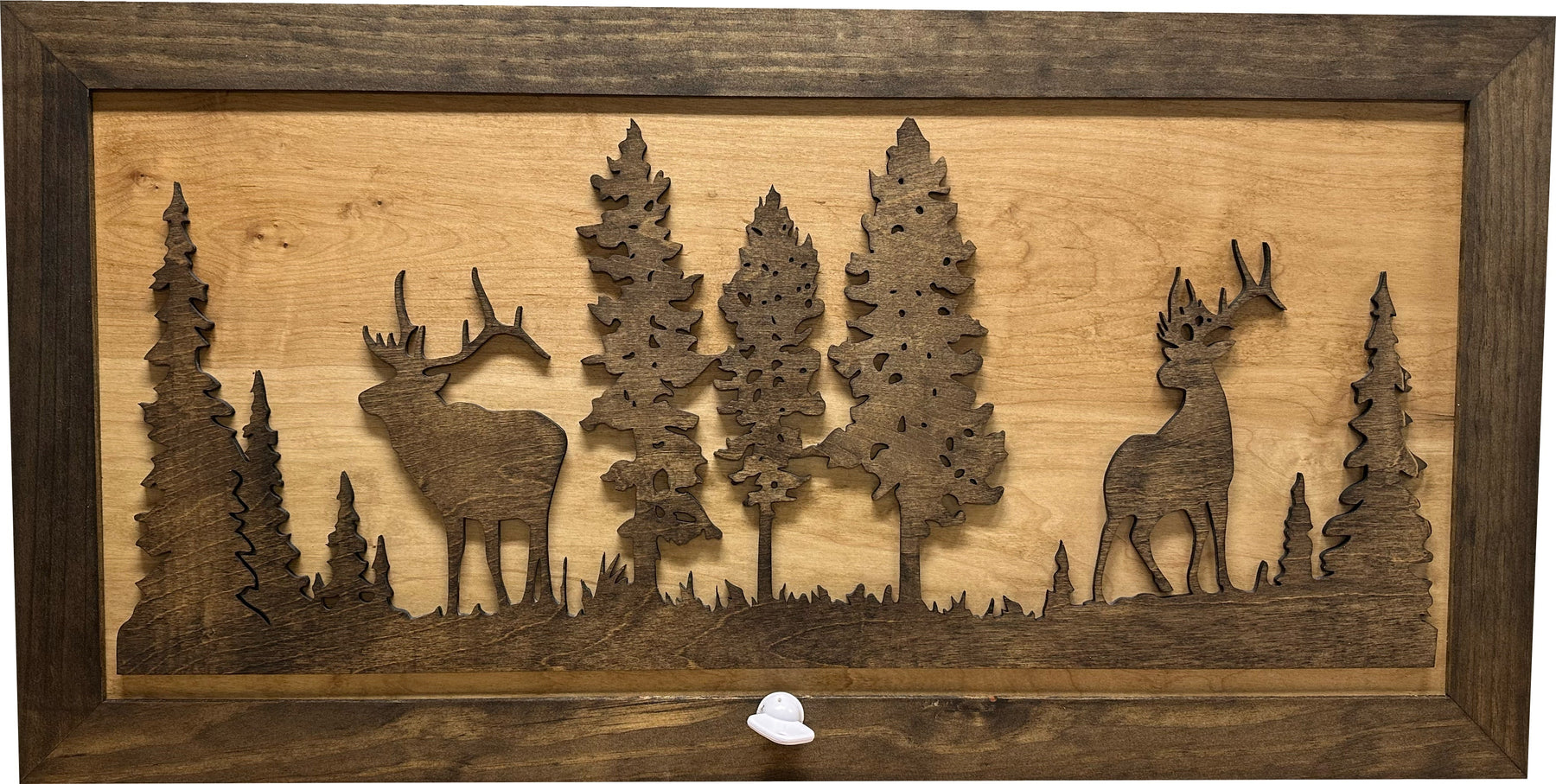 Securely store your gun and other home self defense gear inside the Bellewood Designs Large Hidden Gun Storage Cabinet Wall Decor - Deer and Moose In The Woods Scene. Your firearm and other tactical gear is easily accessible yet securely stored, so you'll never have to worry about leaving it unattended. Once you apply the key the lock immediately disengages and you're ready for self defense. This cabinet features a beautiful brown frame, natural maple background and eye-catching brown 3D deer and moose in the woods scene. The cabinet will be a focal point of any room and no one will ever know what's inside!