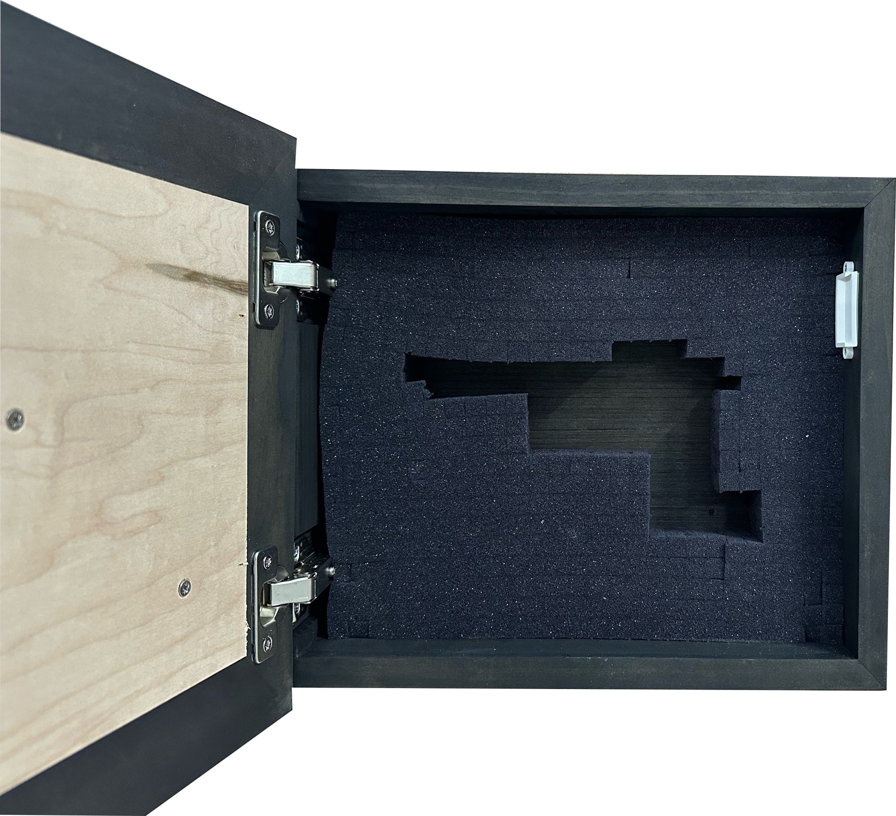This hidden gun safe with a decorative customized monogrammed front with Your Last Name is a secure in wall or on wall gun safe complete with a magnetic lock and a customizable foam insert that is easily modified to fit your gun and other tactical self defense gear. The decorative wall gun case is finished in black stain with a natural maple front and 3D cutout monogram. Our advanced design ensures your gun is safely and securely stored yet quickly accessible when the key is applied. Best of all - No one will ever know what's inside!