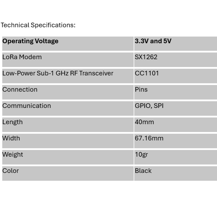 The Semtech LoRa SX1262 device is a Long Range, Low Power, sub-GHz half-duplex RF Transceiver. Designed for long battery life with just 4.2 mA of active receive current consumption. It is able to transmit up to +22 dBm thanks to its integrated power amplifiers. The continuous frequency coverage from 150 MHz to 960 MHz allows the support of all major sub-GHz ISM bands around the world.
