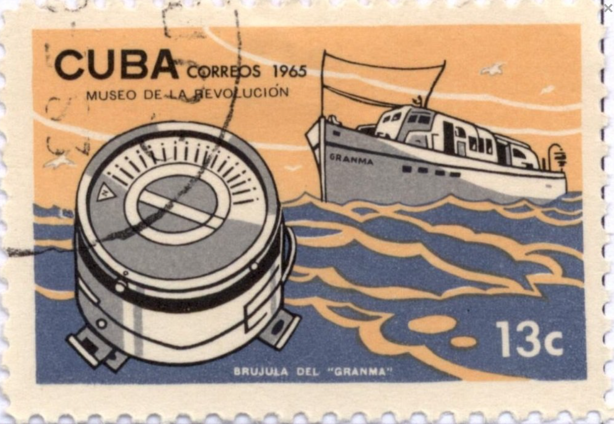 The 13-centavo stamp shows the yacht Granma itself along with the compass used to navigate the Gulf of Mexico on the way to Cuba.