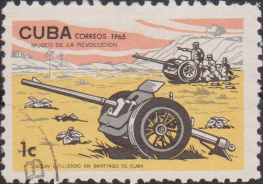 The 1-centavo stamp depicts a 37mm anti-tank gun used by the guerillas of the 26th of July Movement near Santiago.