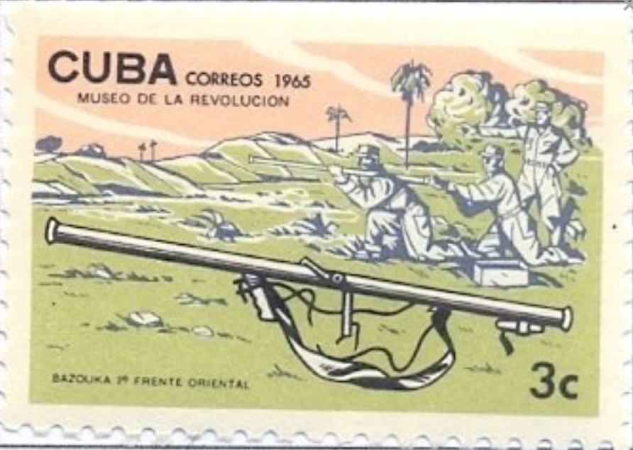 The 3-centavo stamp shows a bazooka anti-tank weapon used by the 26th of July Movement.