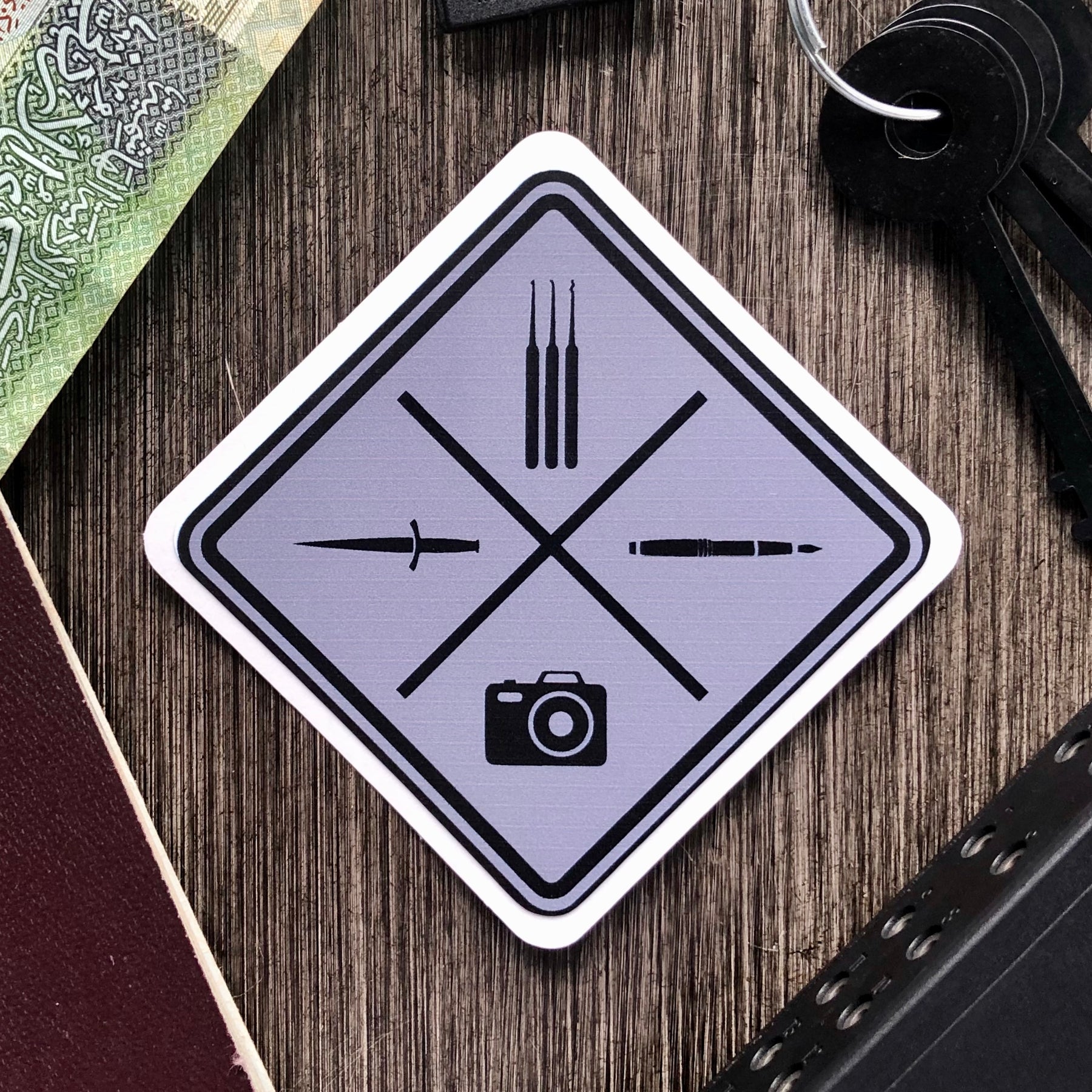 The lock picks are used for surreptitious entry of an adversary's office or home.  The ink pen is for the recording and transmitting of critical intelligence information, or the concealment of a cyanide pill. The camera is for clandestine photography by a confidential source, and the knife is a last line of defense when an agent or case officer is in the enemy's heartland. The gray color represents the Gray Man lifestyle that all the best spies adhere to rigorously; that is, to always blend in to your surroundings while concealing the full measure of your capabilities and preparedness.