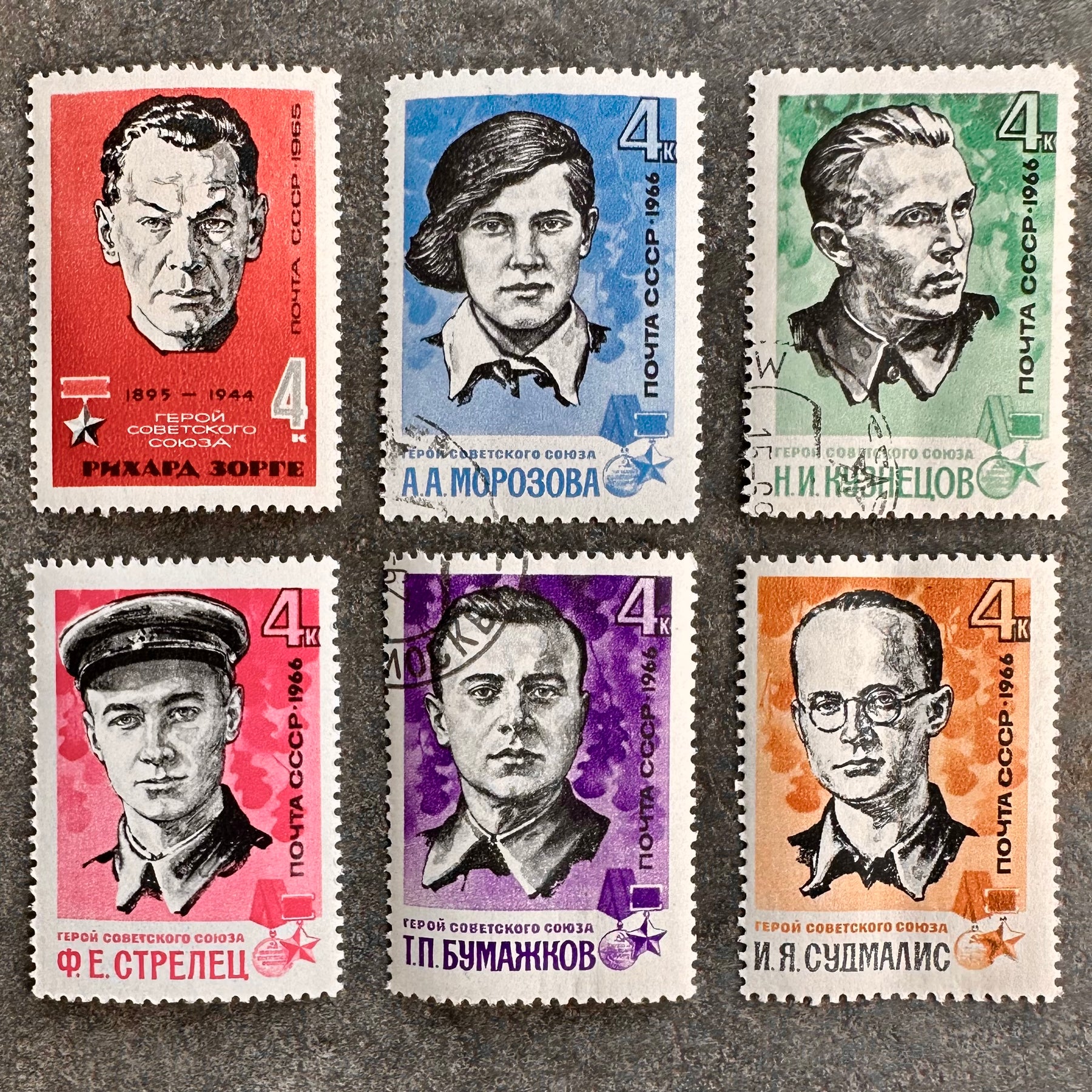 This set of six stamps features six men and women named as Heroes of the Soviet Union. The stamps were issued between 1965 and 1969, and primarily featured intelligence agents and communist partisans who were killed during World War II